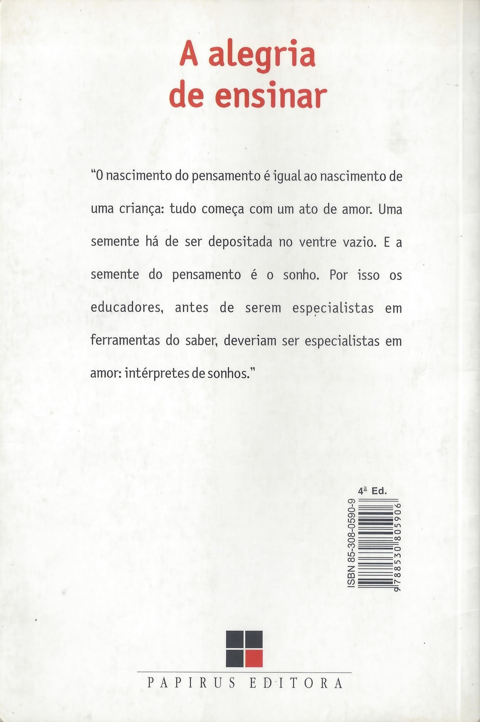 “Ensinar é um exercício de imortalidade. De alguma forma continuamos a viver naqueles cujos olhos aprenderam a ver o mundo pela magia da nossa palavra. O professor, assim, não morre jamais…” – Rubem Alves “O nascimento do pensamento é igual ao nascimento de uma criança: tudo começa com um ato de amor. Uma semente há de ser depositada no ventre vazio. E a semente do pensamento é o sonho. Por isso os educadores, antes de serem especialistas em ferramentas do saber, deveriam ser especialistas em amor: intérpretes de sonhos.” – Rubem Alves (extraído de Google Books)