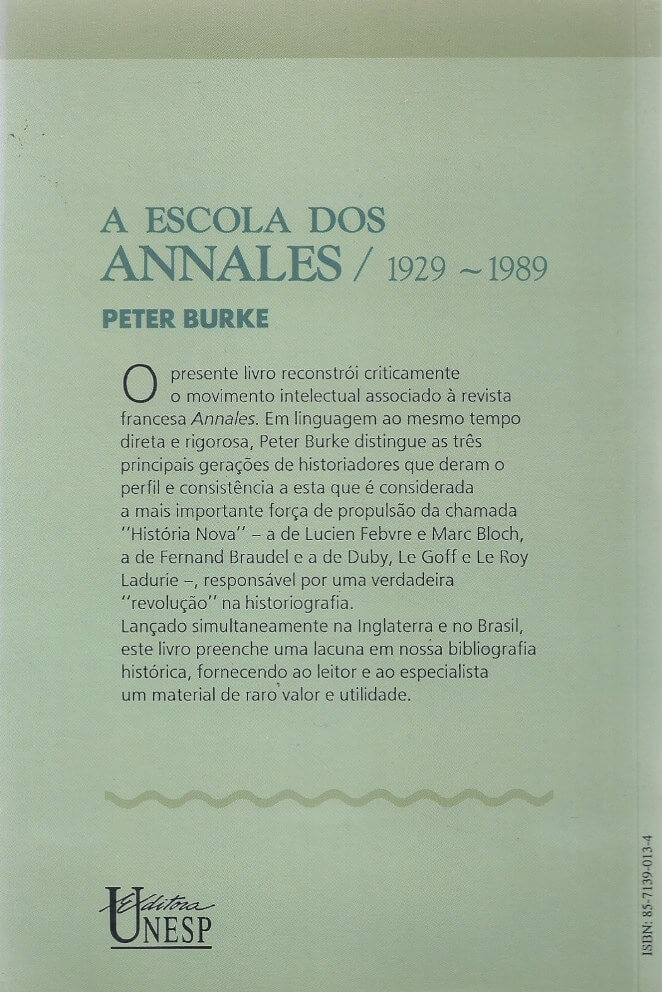 Este livro é a primeira história do movimento surgido na França, agrupado em torno da revista ‘Annales’, desde a sua fundação até o momento. O autor argumenta que este movimento tem sido a mais importante força no desenvolvimento daquilo que passou a ser chamado de Nova História, analisando historiadores como Lucien Febvre e Marc Bloch, os fundadores, passando por Ferdinand Braudel e chegando até Georges Duby, Jacques Le Goff e Le Roy Ladurie. (extraído de Google Books)