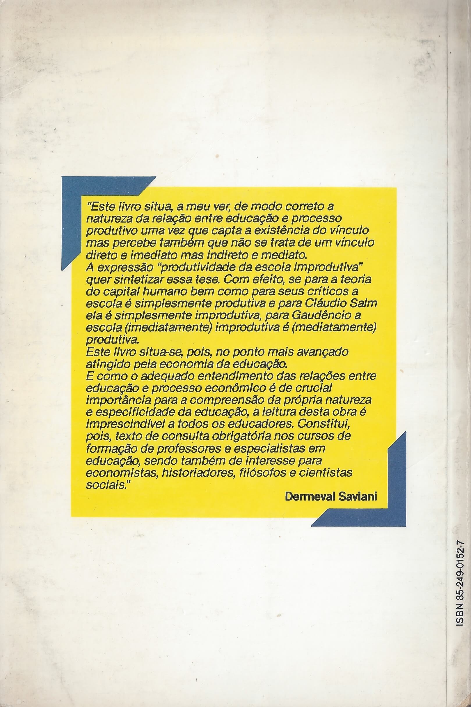 Este livro situa de modo correto a natureza da relação entre educação e processo produtivo, uma vez que capta a existência do vínculo mas percebe também que não se trata de um vínculo direto e imediato, mas indireto e mediato. A expressão produtividade da escola improdutiva quer sintetizar essa tese. Com efeito, se para a teoria do capital humano bem como para seus críticos a escola é simplesmente produtiva e para Cláudio Salam ela é simplesmente improdutiva, para Gaudêncio a escola (imediatamente) improdutiva é (mediatamente) produtiva. Este livro situa-se, pois, no ponto mais avançado atingido pela economia da educação. E como o adequado entendimento das relações entre educação e processo econômico é de crucial importância para a própria compreensão da própria natureza e especificidade da educação, a leitura desta obra é imprescindível a todos os educadores. Constitui, pois, texto e consulta obrigatória nos cursos de formação de professores e especialistas em educação, sendo também de interesse para economistas, historiadores, filósofos e cientistas sociais. (extraído de Google Books)