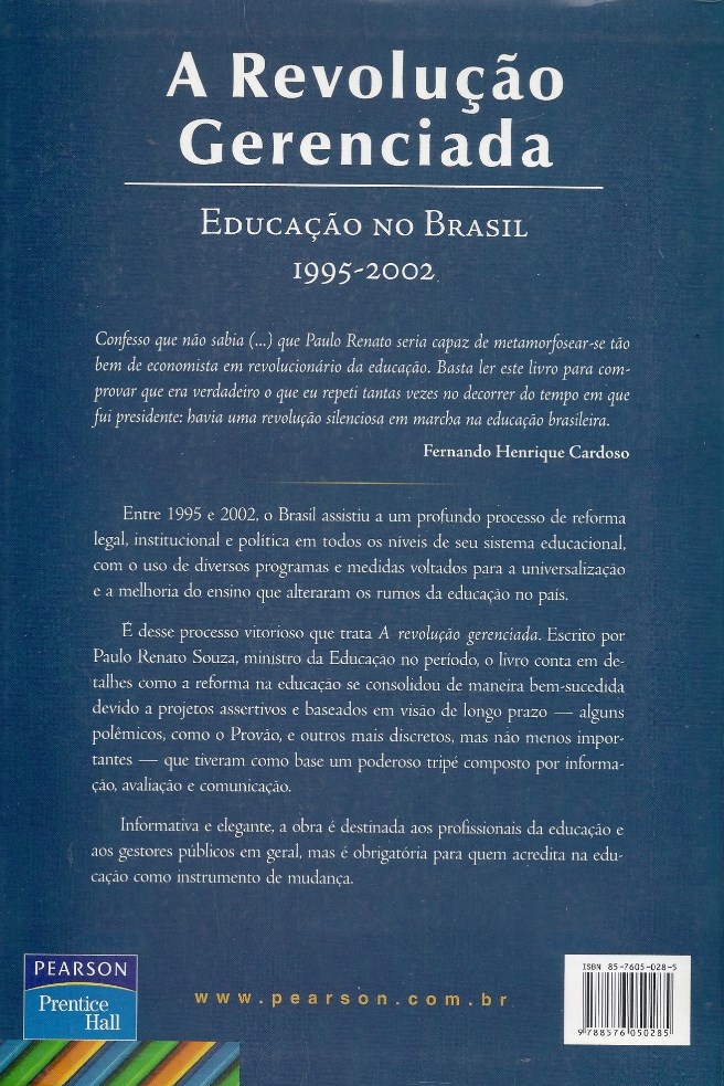 Em ‘A revolução gerenciada’, o ex-ministro da Educação Paulo Renato Souza mostra em detalhes os caminhos que levaram a uma verdadeira revolução em todos os níveis na área educacional brasileira em sua gestão no ministério, entre 1995 e 2002. De maneira informativa, ele destrói mitos ao esmiuçar projetos que geraram repercussão, como o Provão, e traz à tona medidas que passaram praticamente desapercebidas, mas que foram fundamentais para o êxito do processo de mudança, como o diálogo estabelecido entre o governo e a sociedade baseado no tripé informação, avaliação e comunicação. Além disso, traz algumas situações de bastidores que envolveram as principais medidas adotadas. O livro, que conta com prefácio do ex-presidente Fernando Henrique Cardoso, é indicado não só para profissionais da área educacional, mas para os gestores públicos em geral e para todos aqueles que acreditam na educação como instrumento de mudança. (extraído de Google Books)