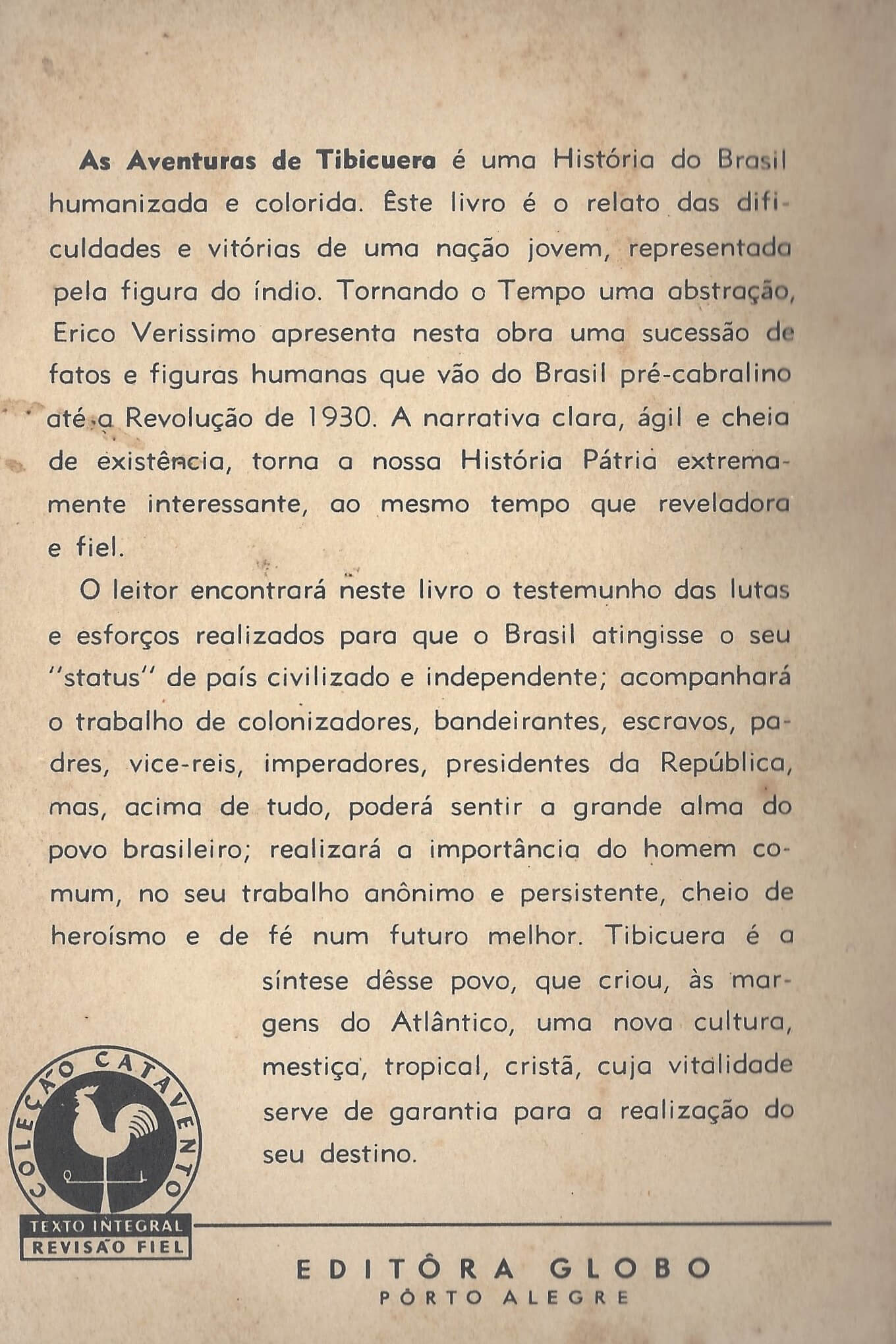 “Aqui estão as aventuras de Tibicuera, contadas por ele próprio. O herói narra sua fabulosa viagem através do tempo, que começou numa taba tupinambá, antes de 1500, e terminou num arranha-céu de Copacabana em 1942.” Assim Erico Verissimo apresenta sua versão da história nacional, publicada em 1937 com o objetivo de fazer frente ao nacionalismo ufanista do Estado Novo. Logo no início, o herói recebe dois presentes do pajé de sua tribo: o apelido Tibicuera, que significa “cemitério” em sua língua, e o segredo da eterna mocidade.