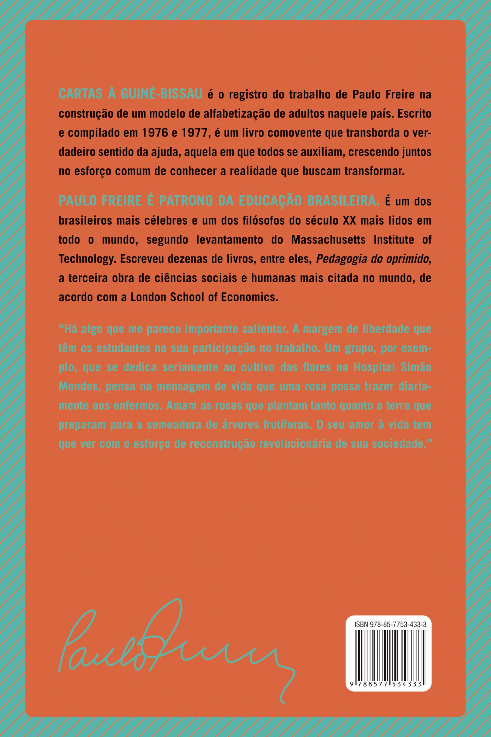 Cartas à Guiné-Bissau é o registro do trabalho de Paulo Freire na construção de um modelo de alfabetização de adultos naquele país. Escrito e compilado em 1976 e 1977, é um livro comovente que transborda o verdadeiro sentido da ajuda, aquela em que todos se auxiliam, crescendo juntos no esforço comum de conhecer a realidade que buscam transformar.