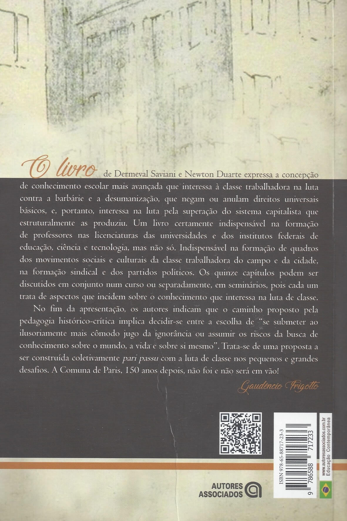 “O livro de Dermeval Saviani e Newton Duarte expressa a concepção de conhecimento escolar mais avançada que interessa à classe trabalhadora na luta contra a barbárie e a desumanização, que negam ou anulam direitos universais básicos, e, portanto, interessa na luta pela superação do sistema capitalista que estruturalmente as produziu. Um livro certamente indispensável na formação de professores nas licenciaturas das universidades e dos institutos federais de educação, ciência e tecnologia, mas não só. Indispensável na formação de quadros dos movimentos sociais e culturais da classe trabalhadora do campo e da cidade, na formação sindical e dos partidos políticos. Os quinze capítulos podem ser discutidos em conjunto num curso ou separadamente, em seminários, pois cada um trata de aspectos que incidem sobre o conhecimento que interessa na luta de classe. No fim da apresentação, os autores indicam que o caminho proposto pela pedagogia histórico-crítica implica decidir-se entre a escolha de “se submeter ao ilusoriamente mais cômodo jugo da ignorância ou assumir os riscos da busca de conhecimento sobre o mundo, a vida e sobre si mesmo”. Trata-se de uma proposta a ser construída coletivamente pari passu com a luta de classe nos pequenos e grandes desafios. A Comuna de Paris, 150 anos depois, não foi e não será em vão!” [trecho do Prefácio, redigido por Gaudêncio Frigotto]