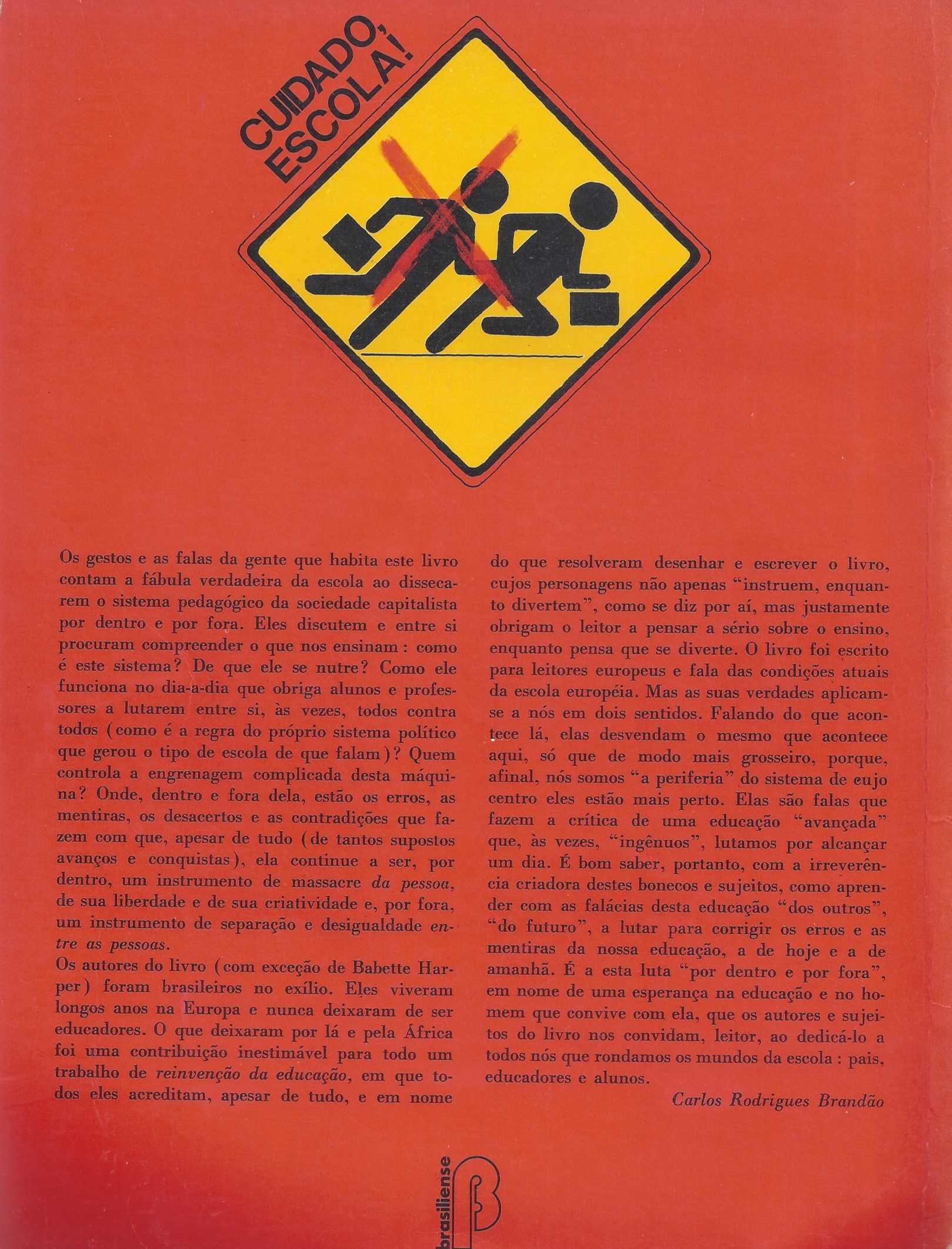 Os autores do livro (com exceção de Babette Harper) foram brasileiros no exílio. Eles viveram longos anos na Europa e nunca deixaram de ser educadores. O que deixaram por lá e pela África foi uma contribuição inestimável para todo um trabalho de reinvenção da educação, em que todos eles acreditam, apesar de tudo, e em nome do que resolveram desenhar e escrever o livro, cujos personagens não apenas “instruem, enquanto divertem”, como se diz por aí, mas justamente obrigam o leitor a pensar a sério sobre o ensino, enquanto pensa que se diverte. O livro foi escrito para leitores europeus e fala das condições atuais da escola europeia. Mas as suas verdades aplicam-se a nós em dois sentidos. Falando do que acontece lá, elas desvendam o mesmo que acontece aqui, só que de modo mais grosseiro, porque, afinal, nós somos “a periferia” do sistema de cujo centro eles estão mais perto. Elas são falas que fazem a crítica de uma educação “avançada” que, às vezes, “ingênuos”, lutamos por alcançar um dia. É bom saber, portanto, com a irreverência criadora destes bonecos e sujeitos, como aprender com as falácias desta educação “dos outros”, “do futuro”, a lutar para corrigir os erros e as mentiras da nossa educação, da de hoje e a de amanhã. É a esta luta “por dentro e por fora”, em nome de uma esperança na educação e no homem que convive com ela, que os autores e sujeitos do livro nos convidam, leitor, ao dedicá-lo a todos nós que rondamos os mundos da escola: pais, educadores e alunos.