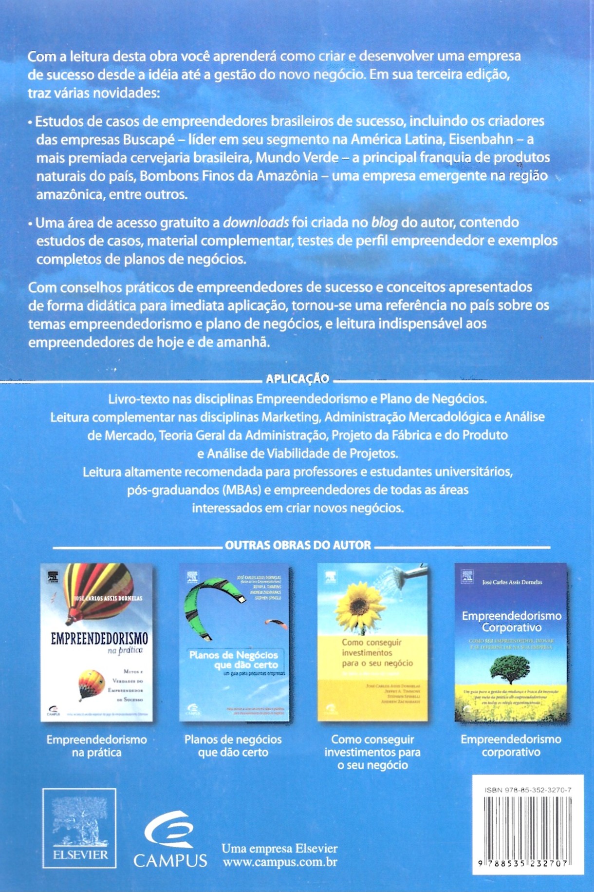 O empreendedor é aquele que faz as coisas acontecerem, se antecipa aos fatos e tem uma visão futura da organização! Esta definição desenvolvida ainda na primeira edição do livro se tornou clássica. O empreendedorismo está hoje presente em mais grades curriculares de cursos de ensino superior do que nunca. Além de administradores, seu público original, engenheiros, arquitetos, dentistas, médicos, fisioterapeutas, sociólogos, psicólogos e estudantes de todas as áreas são expostos à disciplina de empreendedorismo em diversas instituições no Brasil. Esta obra tem historicamente trazido conceitos teóricos, discussão acadêmica e reflexão na medida exata, colocando o leitor em condições de praticar a construção de seu negócio e análise das oportunidades de maneira crítica e prática. Um plano de negócios pode ser elaborado como produto final do estudo. O livro traz três novos estudos de caso de grande visibilidade que se somam a três já existentes na edição anterior e que foram atualizados. Especialmente para essa edição comemorativa dos anos foi desenvolvida uma série de vídeos com empreendedores cobrindo os mais variado s tópicos do livro. Essas pílulas multimídia são um recurso inovador para motivar os alunos em sala e suportar uma grande gama de atividades complementares individuais e em grupo. (extraído de Amazon)