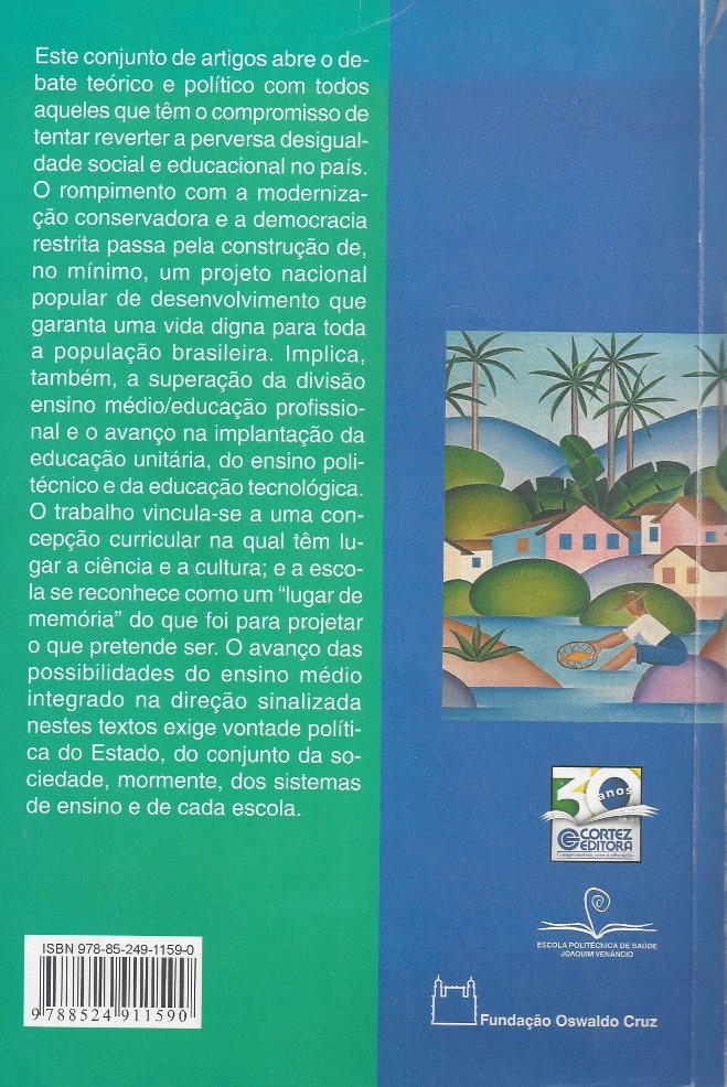 Este conjunto de artigos abre o debate teórico e político com todos aqueles que têm o compromisso de tentar reverter a perversa desigualdade social e educacional no país. O rompimento com a modernização conservadora e a democracia restrita passa pela construção de, no mínimo, um projeto nacionalpopular de desenvolvimento que garanta uma vida digna para toda a população brasileira. Implica, também, a superação da divisão ensino médio/educação profissional e o avanço na implantação da educação unitária, do ensino politécnico e da educação tecnológica. O trabalho vincula-se a uma concepção curricular na qual têm lugar a ciência e a cultura; e a escola se reconhece como um ‘lugar de memória’ do que foi para projetar o que pretende ser. O avanço das possibilidades do ensino médio integrado na direção sinalizada nestes textos exige vontade política do Estado, do conjunto da sociedade, mormente, dos sistemas de ensino e de cada escola. (extraído de Google Books)