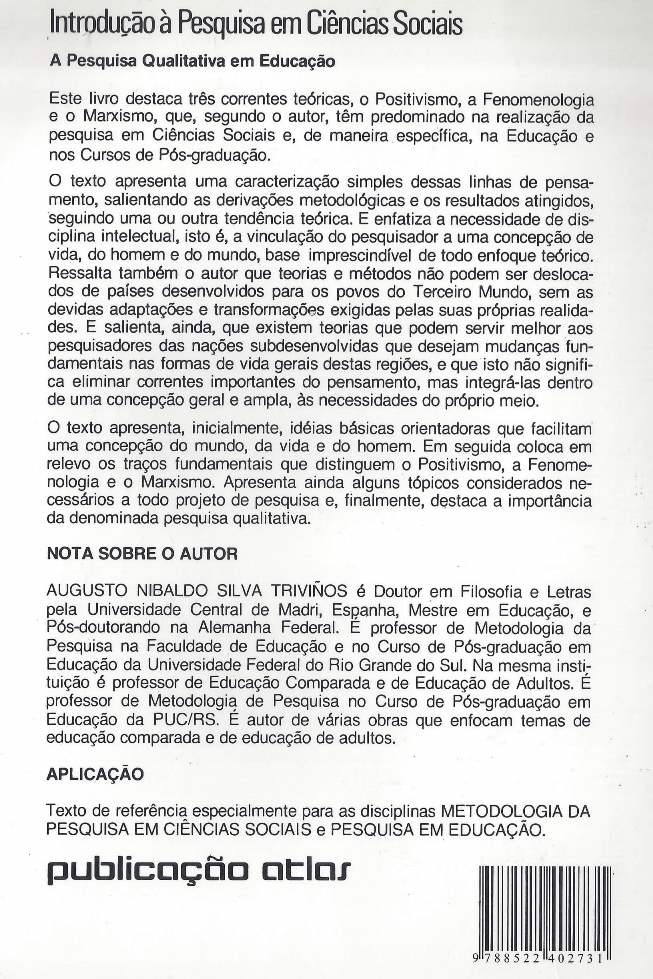 Este livro destaca três correntes teóricas, o Positivismo, a Fenomenologia e o Marxismo, que, segundo o autor, têm predominado na realização da pesquisa em Ciências Sociais e, de maneira específica, na Educação e nos Cursos de Pós-graduação. O texto apresenta uma caracterização simples dessas linhas de pensamento, salientando as derivações metodológicas e os resultados atingidos, seguindo uma ou outra tendência teórica. E enfatiza a necessidade de disciplina intelectual, isto é, a vinculação do pesquisador a uma concepção de vida, do homem e do mundo, base imprescindível de todo enfoque teórico. Ressalta também o autor que teorias e métodos não podem ser deslocados de países desenvolvidos para os povos do Terceiro Mundo, sem as devidas adaptações e transformações exigidas pelas suas próprias realidades. E salienta, ainda, que existem teorias que podem servir melhor aos pesquisadores das nações subdesenvolvidas que desejam mudanças fundamentais nas formas de vida gerais destas regiões, e que isto não significa eliminar correntes importantes do pensamento, mas integrá-las dentro de uma concepção geral e ampla, às necessidades do próprio meio. O texto apresenta, inicialmente, ideias básicas orientadoras que facilitam uma concepção do mundo, da vida e do homem. Em seguida coloca em relevo os traços fundamentais que distinguem o Positivismo, a Fenomenologia e o Marxismo. Apresenta ainda alguns tópicos considerados necessários a todo projeto de pesquisa e, finalmente, destaca a importância da denominada pesquisa qualitativa. (extraído de Amazon)