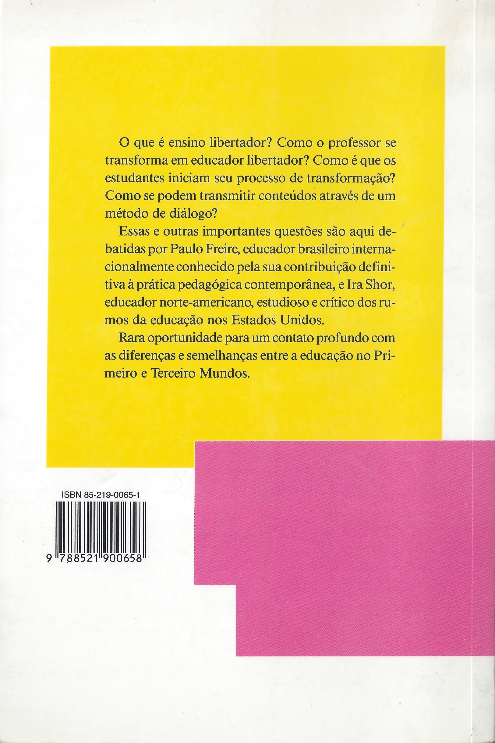 Mais uma obra do grande estudioso da educação brasileira. Paulo Freire e Ira Shor trabalham com as angústias cotidianas do professor na experimentação da pedagogia do diálogo, nas mudanças de atitudes práticas e teóricas que a escolha dessa concepção de educação implica. É um estímulo, já que fornece respostas e sugere soluções às questões do dia-a-dia. (extraído de Google Books)