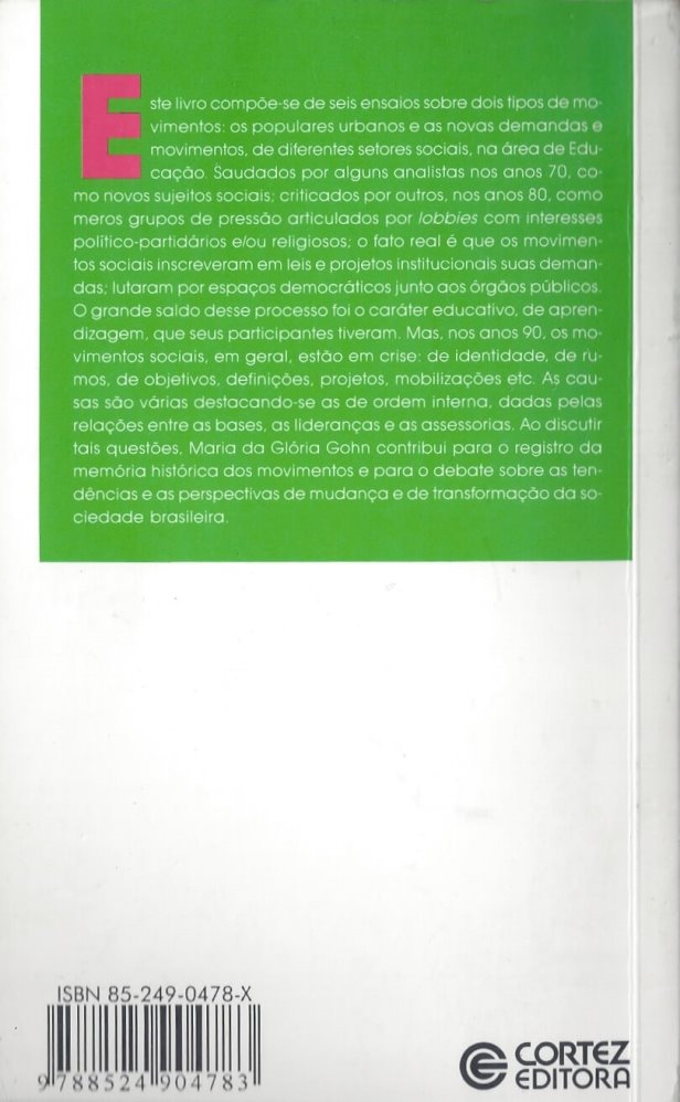 Este livro compõe-se de seis ensaios sobre dois tipos de movimentos: os populares urbanos e as novas demandas e movimentos, de diferentes setores sociais, na área da Educação. Saudados por alguns analistas nos anos 70, como novos sujeitos sociais; criticados por outros, nos anos 80, como meros grupos de pressão articulados por lobbies com interesses político-partidários e/ou religiosos; o fato real é que os movimentos sociais inscreveram em leis e projetos institucionais suas demandas; lutaram por espaços democráticos junto aos órgãos públicos. O grande saldo desse processo foi o caráter educativo, de aprendizagem, que seus participantes tiveram. Mas, nos anos 90, os movimentos sociais, em geral, estão em crise: de identidade, de rumos, de objetivos, definições, projetos, mobilizações etc. As causas são várias destacando-se as de ordem interna, dadas pelas relações entre as bases, as lideranças e as assessorias. Ao discutir tais questões, Maria da Glória Gohn contribui para o registro da memória histórica dos movimentos e para o debate sobre as tendências e as perspectivas de mudança e de transformação da sociedade brasileira.