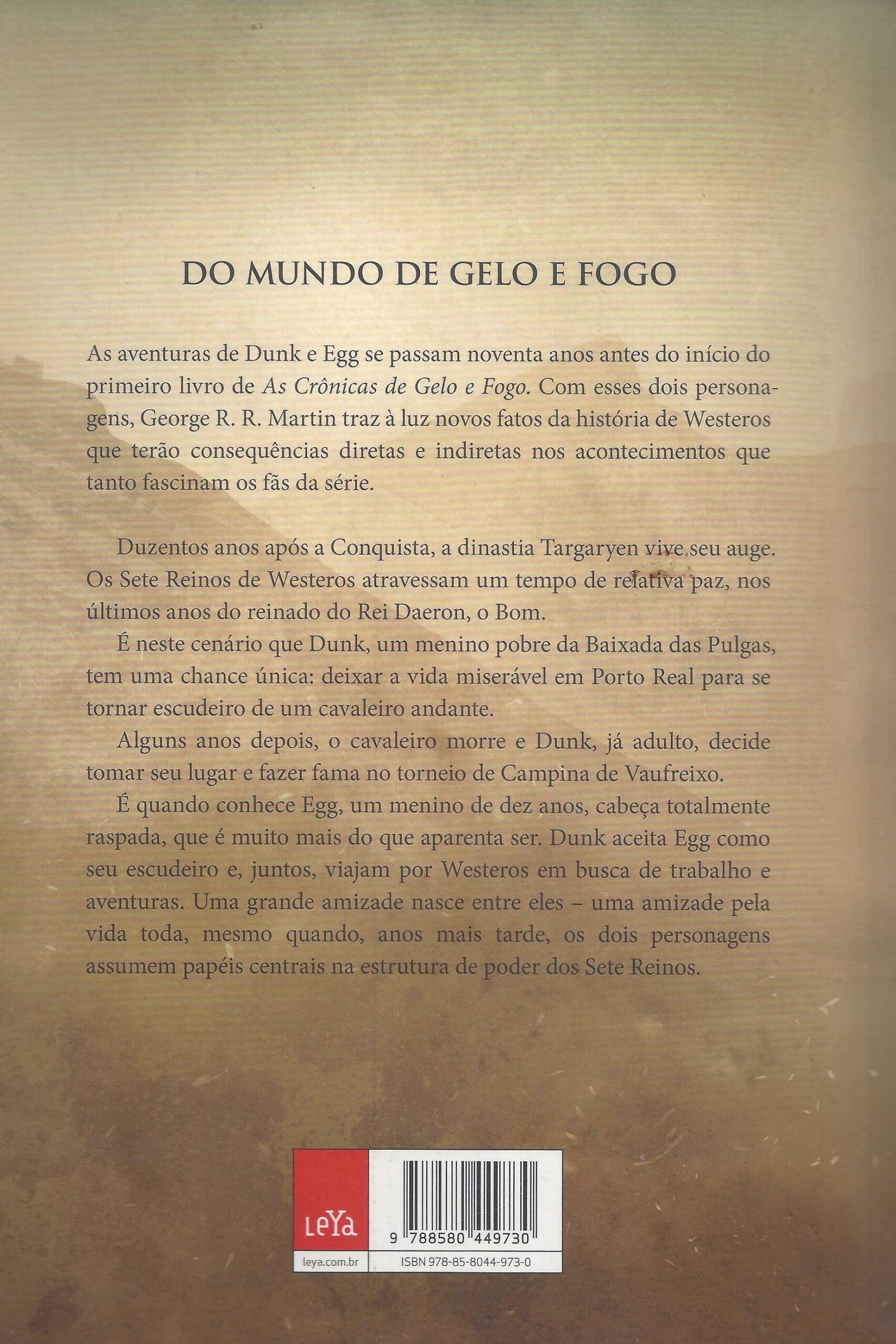Duzentos anos após a Conquista, a dinastia Targaryen vive seu auge. Os Sete Reinos de Westeros atravessam um tempo de relativa paz, nos últimos anos do reinado do Bom Rei Daeron. É neste cenário que Dunk, um menino pobre da Baixada das Pulgas, tem uma chance única: deixar a vida miserável em Porto Real para se tornar escudeiro de um cavaleiro andante. Quando adulto, o cavaleiro morre e Dunk decide tomar seu lugar e fazer fama no torneio de Campina de Vaufreixo. É quando conhece Egg, um menino de dez anos, cabeça totalmente raspada, que é muito mais do que aparenta ser. Dunk aceita Egg como seu escudeiro e, juntos, viajam por Westeros em busca de trabalho e aventuras. Uma grande amizade nasce entre eles uma amizade pela vida toda, mesmo quando, anos mais tarde, os dois personagens assumem papéis centrais na estrutura de poder dos Sete Reinos.As aventuras de Dunk e Egg trazem para os fãs de As Crônicas de Gelo e Fogo a oportunidade única de vivenciar outro momento da história de Westeros, de conhecer e analisar fatos que teriam desdobramentos noventa anos depois, na guerra dos tronos. (extraído de Google Books)
