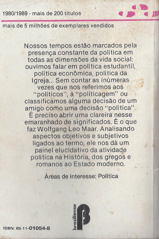 Hoje, a política está presente em todas as dimensões da vida social – ouvi-se falar em política estudantil, política econômica, política da Igreja, entre tantas outras. Sem contar as inúmeras vezes que nos referimos aos ‘políticos’, à ‘politicagem’ ou classificamos alguma decisão de um amigo como uma atitude ‘política’. Neste livro, Wolfgang Leo Maar abre uma clareira nesse emaranhado de significados. Analisando aspectos objetivos e subjetivos ligados ao termo, ele dá um painel elucidativo da atividade política na História, dos gregos e romanos ao Estado moderno. (extraído de Google Books)