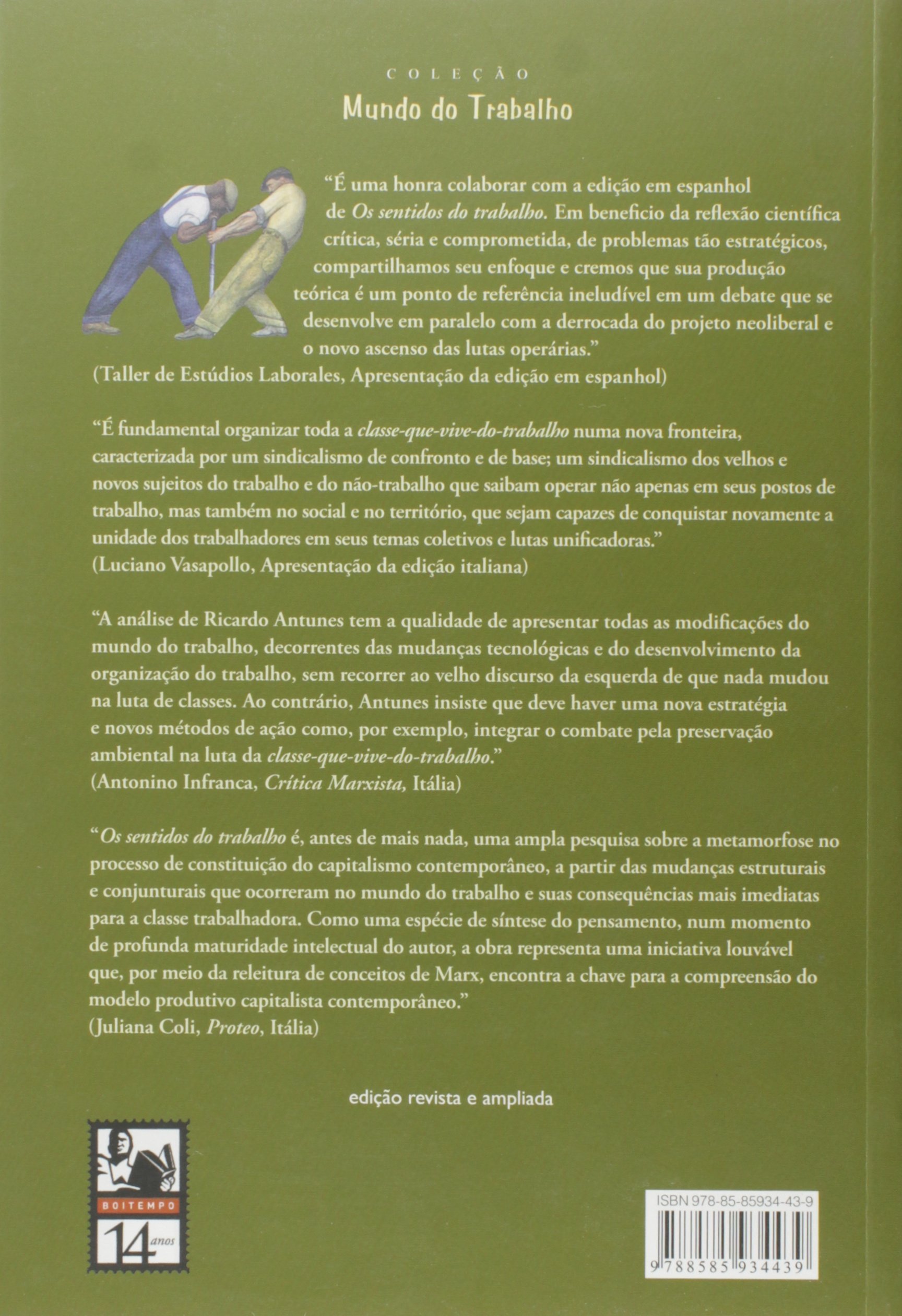 Em Os sentidos do trabalho, Ricardo Antunes demonstra que a sociedade do trabalho abstrato possibilitou, por meio da constituição de uma massa de trabalhadores expulsos do processo produtivo, a aparência da sociedade fundada no descentramento da categoria trabalho e na perda de centralidade do ato laborativo no mundo contemporâneo. O autor também alerta, porém, para o fato de que o entendimento das mutações em curso no mundo operário nos obriga a ir além das aparências. Ao fazer isso, lembra que o sentido dado ao trabalho pelo capital é completamente diverso do sentido atribuído pela humanidade. (extraído de Google Books)