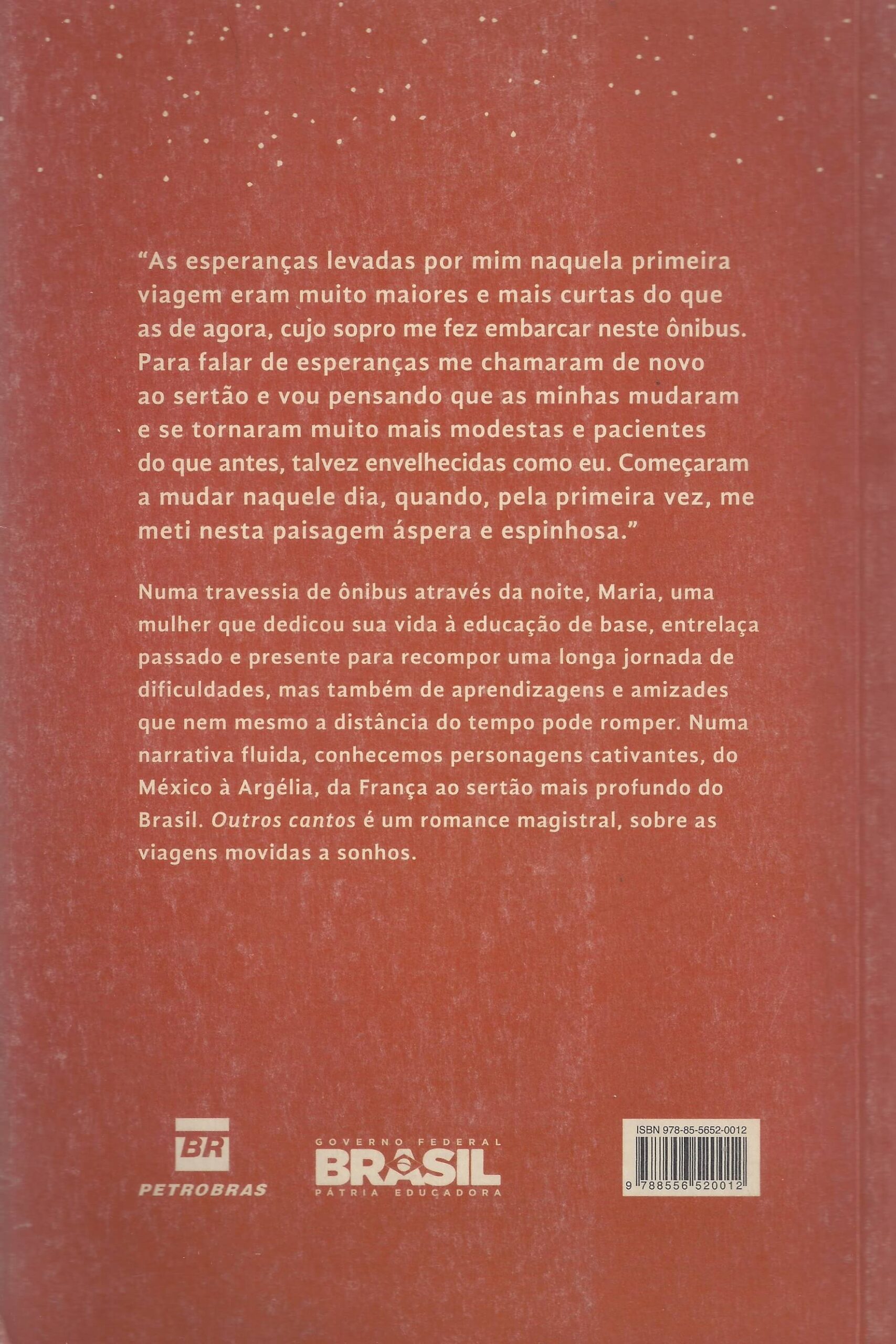 Livro vencedor do Prêmio São Paulo de Literatura 2017. Novo livro da vencedora do Prêmio Jabuti 2015 de melhor romance traz uma narrativa comovente sobre passado e futuro. Numa travessia de ônibus pela noite, Maria, uma mulher que dedicou a vida à educação de base, entrelaça passado e presente para recompor uma longa jornada que nem mesmo a distância do tempo pode romper. Em uma escrita fluida, conhecemos personagens cativantes de diversos lugares do mundo e memórias que desfiam uma série de impossíveis amores, dos quais Maria guarda lembranças escondidas numa “caixinha dos patuás posta em sossego lá no fundo do baú”. Com sutileza e domínio da narrativa, Maria Valéria Rezende vai compondo um retrato emocionante dessa mulher determinada, que sacrifica a própria vida em troca de algo maior. Outros cantos é um romance magistral, sobre as viagens movidas a sonhos. (extraído de Google Books)
