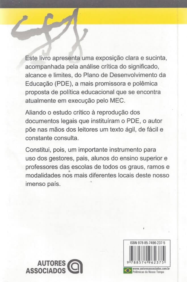 O livro complementa um trabalho de pesquisa e análise crítica desenvolvido em outros livros de Dermeval Saviani, tais como: Educação brasileira; Política e educação no Brasil; A nova lei da educação e Da nova LDB ao Fundeb. Especificamente neste livro, PDE, o autor trabalha as ações previstas pelo Plano de Desenvolvimento da Educação lançado pelo MEC que, numa de suas atualizações, em julho de 2008, continha 53 ações para aumentar a qualidade na educação nacional. Dentre suas ações, destacam-se os programas: Compromisso Todos pela Educação (com apoio de entidades não governamentais), a Provinha Brasil, a criação de piso salarial para os professores, a realização da Olimpíada de Língua Portuguesa, o aumento de escolas em áreas rurais e estabelecimento de metas para diminuir a evasão das escolas e o número de analfabetos. Com a análise do PDE, Saviani indaga: Em que medida esse novo plano se revela efetivamente capaz de enfrentar a questão da qualidade do ensino nas escolas de educação básica? A partir daí, tece suas críticas e propostas de melhoria. (extraído de Amazon)