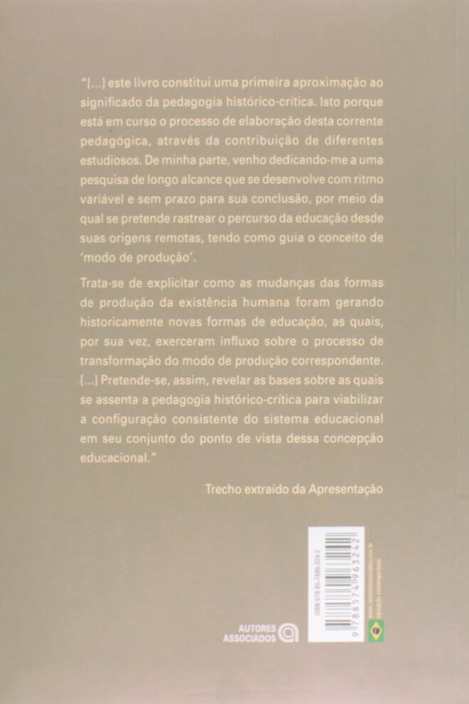 “[…] este livro constitui uma primeira aproximação ao significado da pedagogia histórico-crítica. Isto porque está em curso o processo de elaboração desta corrente pedagógica, através da contribuição de diferentes estudiosos. De minha parte, venho dedicando-me a uma pesquisa de longo alcance que se desenvolve com ritmo variável e sem prazo para sua conclusão, por meio da qual se pretende rastrear o percurso da educação desde suas origens remotas, tendo como guia o conceito de ‘modo de produção’. Trata-se de explicitar como as mudanças das formas de produção da existência humana foram gerando historicamente novas formas de educação, as quais, por sua vez, exerceram influxo sobre o processo de transformação do modo de produção correspondente. […] Pretende-se, assim, revelar as bases sobre as quais se assenta a pedagogia histórico-crítica para viabilizar a configuração consistente do sistema educacional em seu conjunto do ponto de vista dessa concepção educacional.” Trecho extraído da Apresentação (extraído de Google Books)
