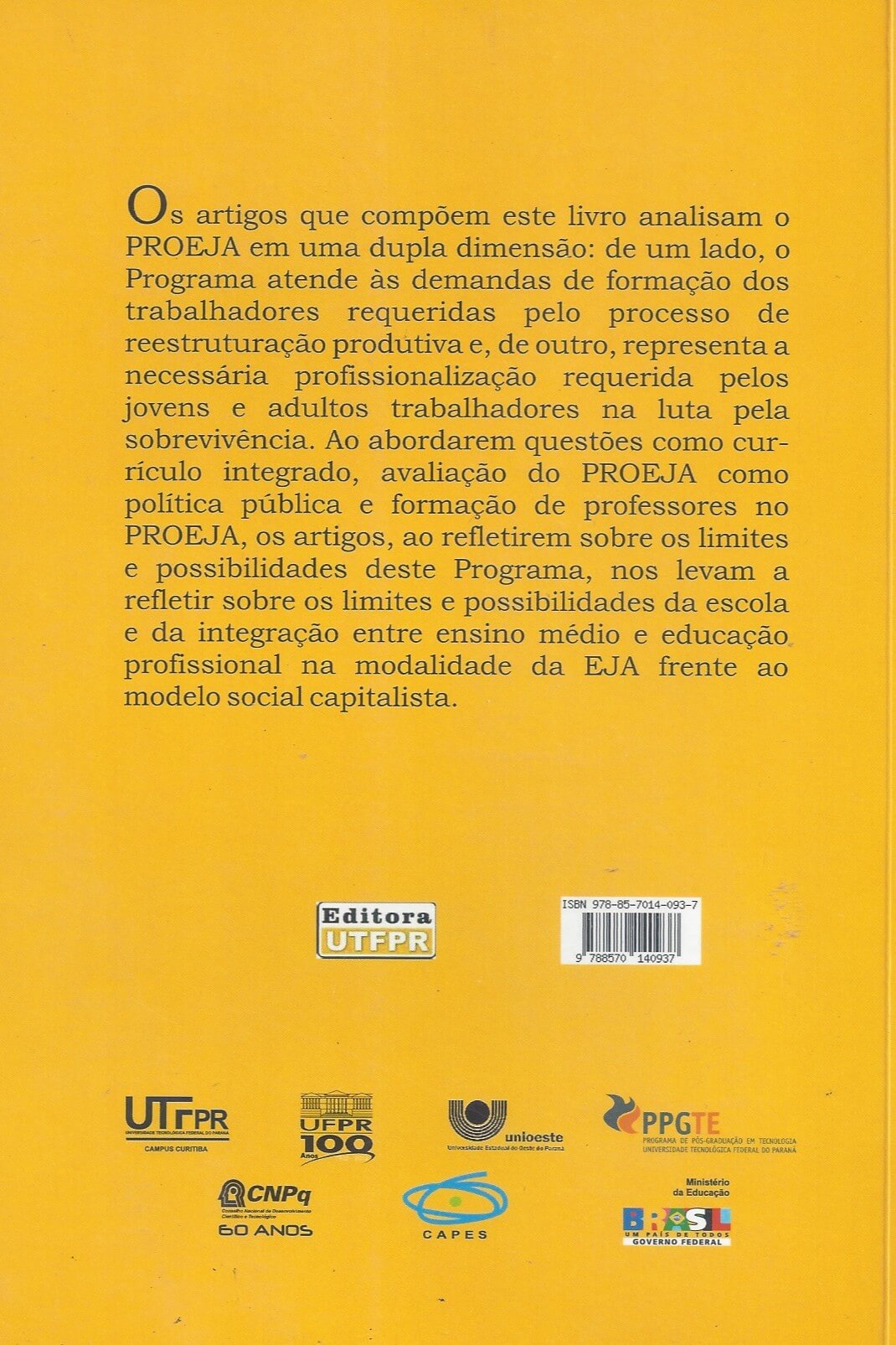 Os artigos que compõem este livro analisam o PROEJA em uma dupla dimensão: de um lado, o Programa atende às demandas de formação dos trabalhadores requeridas pelo processo de reestruturação produtiva e, de outro, representa a necessária profissionalização requerida pelos jovens e adultos trabalhadores na luta pela sobrevivência. Ao abordarem questões como currículo integrado, avaliação do PROEJA como política pública e formação de professores no PROEJA, os artigos, ao refletirem sobre os limites e possibilidades deste Programa, nos levam a refletir sobre os limites e possibilidades da escola e da integração entre ensino médio e educação profissional na modalidade da EJA frente ao modelo social capitalista.