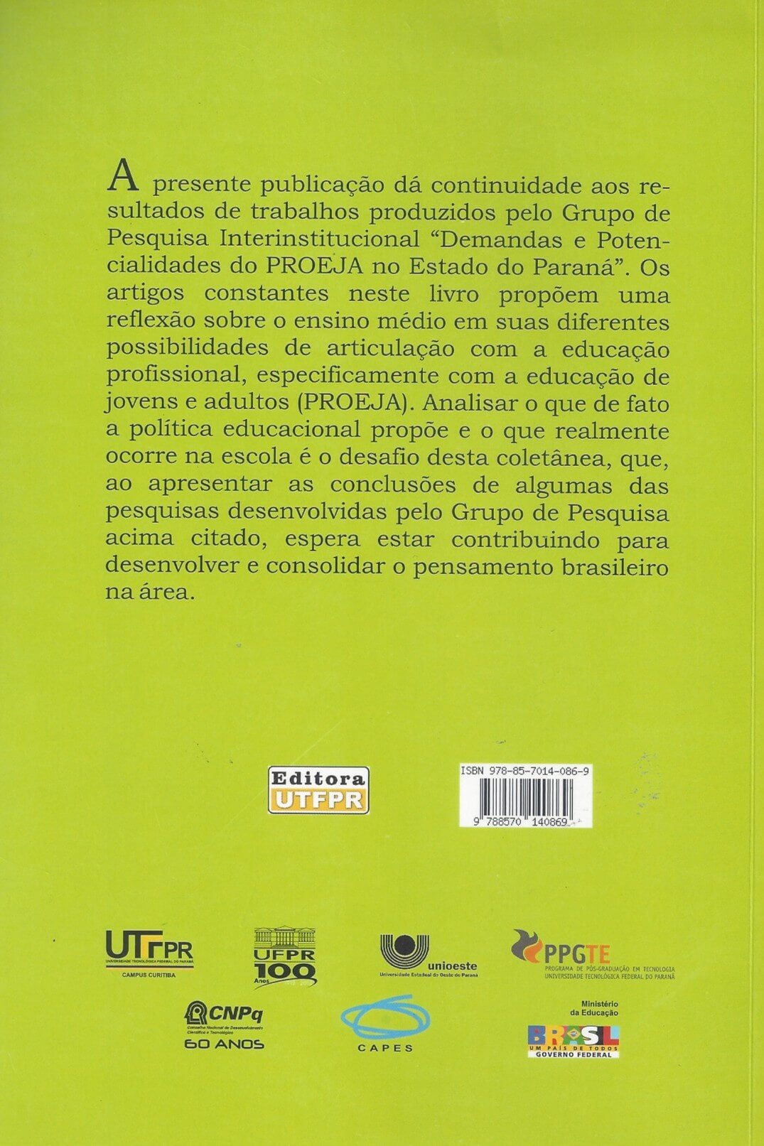A presente publicação dá continuidade aos resultados de trabalhos produzidos pelo Grupo de Pesquisa Interinstitucional “Demandas e Potencialidades do PROEJA no Estado do Paraná”. Os artigos constantes neste livro propõem uma reflexão sobre o ensino médio em suas diferentes possibilidades de articulação com a educação profissional, especificamente com a educação de jovens e adultos (PROEJA). Analisar o que de fato a política educacional propõe e o que realmente ocorre na escola é o desafio desta coletânea, que, ao apresentar as conclusões de algumas das pesquisas desenvolvidas pelo Grupo de Pesquisa acima citado, espera estar contribuindo para desenvolver e consolidar o pensamento brasileiro na área.