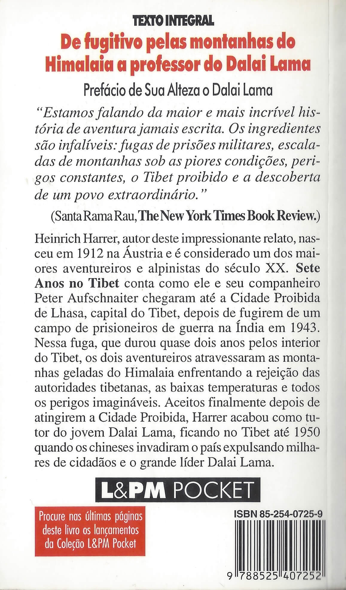 Henrich Harrer, autor deste impressionante relato, nasceu em 1912 na Áustria e é considerado um dos maiores aventureiros e alpinistas do século XX. Sete anos no Tibet conta como ele e seu companheiro Peter Aufschnaiter chegaram até a cidade Proibida de Lhasa, capital do Tibet, depois de fugirem de um campo de prisioneiros de guerra da índia em 1943. Nessa fuga, que durou quase dois anos pelo interior do Tibet, os dois aventureiros atravessaram as montanhas geladas do Himalaia enfrentando a rejeição das autoridades tibetanas, as baixas temperaturas e todos os perigos imagináveis. Aceitos finalmente depois de atingirem a Cidade Proibida, Harrer acabou como tutor do jovem Dalai Lama, ficando no Tibet até 1950, quando os chineses invadiram o país expulsando milhares de cidadãos e o grande líder Dalai Lama. (extraído de Google Books)