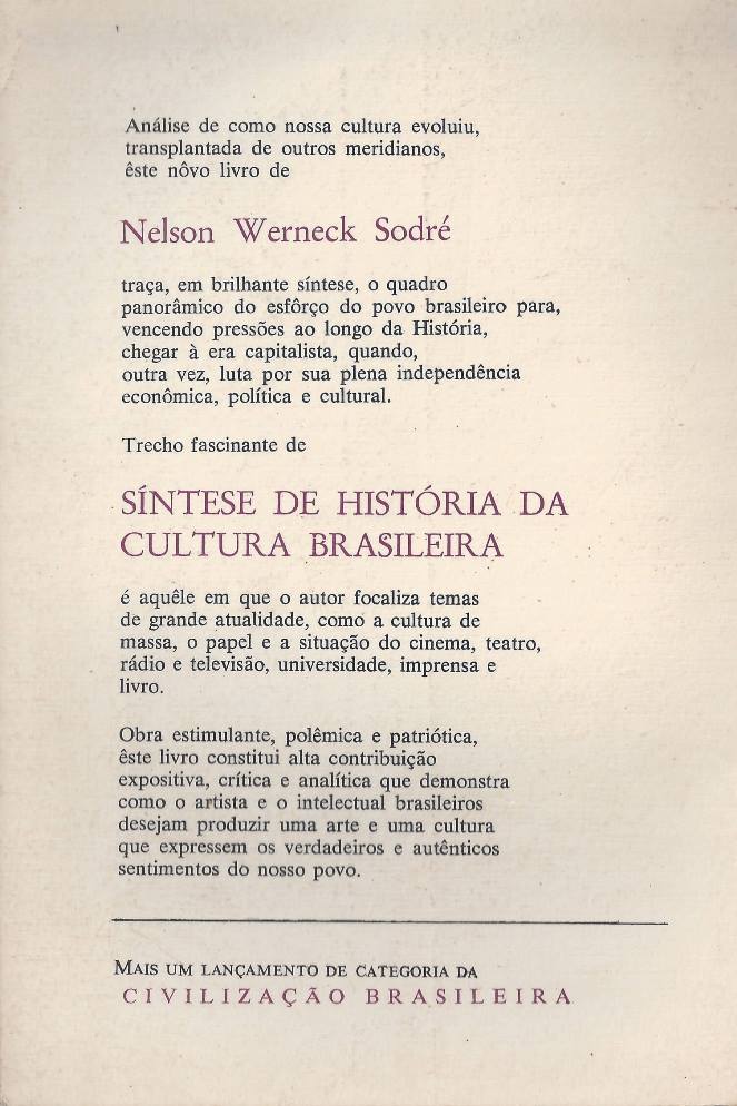 Traça o quadro panorâmico do esforço do povo brasileiro, ao longo da história, para chegar à era capitalista, quando luta pela sua plena independência econômica, política e cultural. Focaliza temas de grande atualidade, como a cultura de massa, o papel e a situação do cinema, teatro, rádio e televisão, universidade, imprensa e livro. (extraído de Google Books)