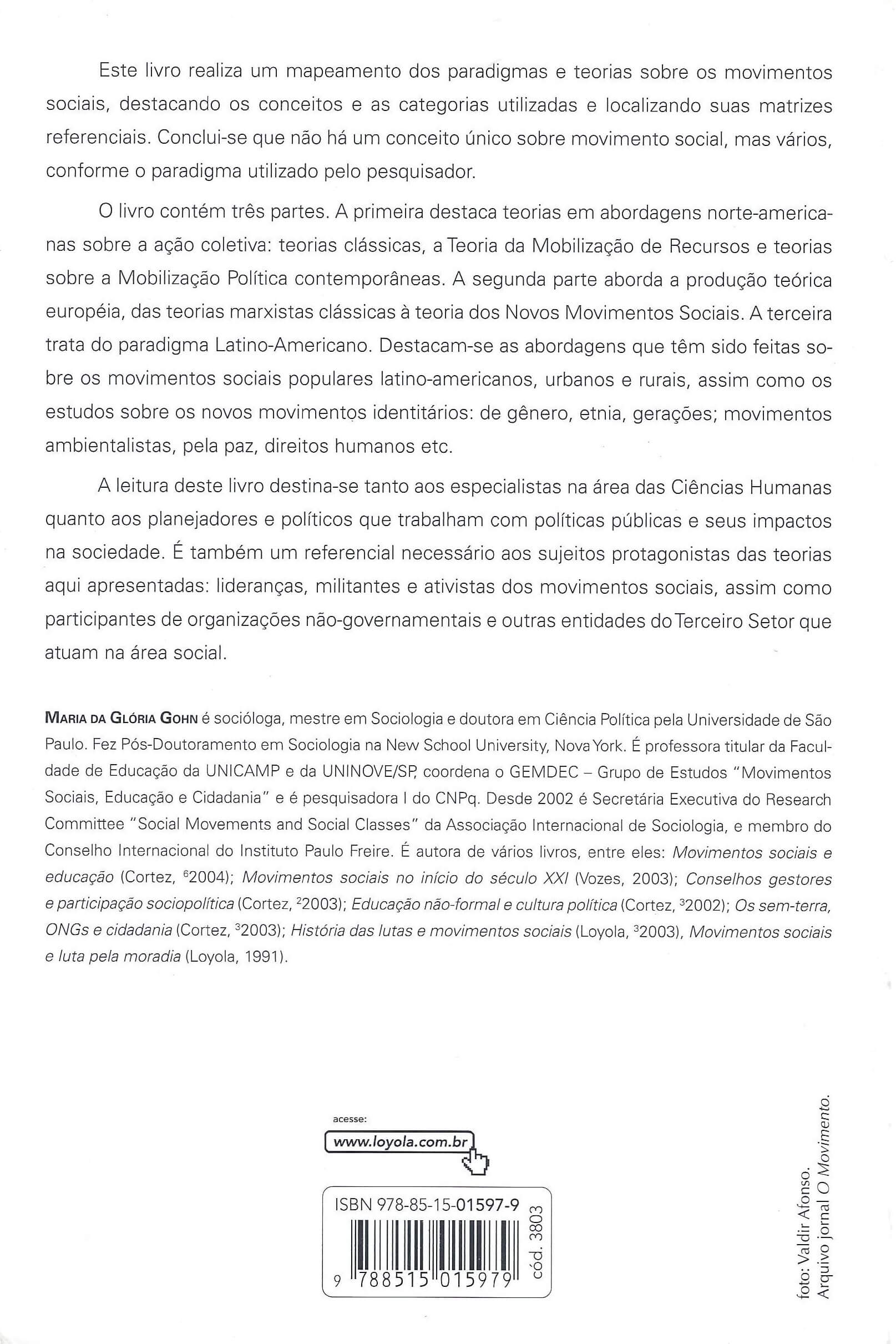 Este livro foi escrito segundo quatro objetivos básicos: 1. SIstematizar as principais teorias e os paradigmas correspondentes sobre os movimentos sociais na produção das ciências sociais contemporânea. 2. REalizar um estudo comparativo entre essas teorias, apresentando suas diferenças, semelhanças e o debate que elas têm mantido entre si. 3. CAracterizar as linhas gerais do paradigma explicativo que tem sido utilizado para o estudo dos movimentos sociais na América Latina, apresentando algumas inadequações no uso das teorias correntes, a partir da caracterização dos cenários sociopolíticos e econômicos das lutas sociais latino-americanas. 4. DElinear tendências que estão sendo construídas ao redor da temática/problemática dos movimentos sociais no Brasil, a partir de transformações ocasionadas pela globalização da economia, da política e das relações socioculturais em geral. (extraído de Google Books)